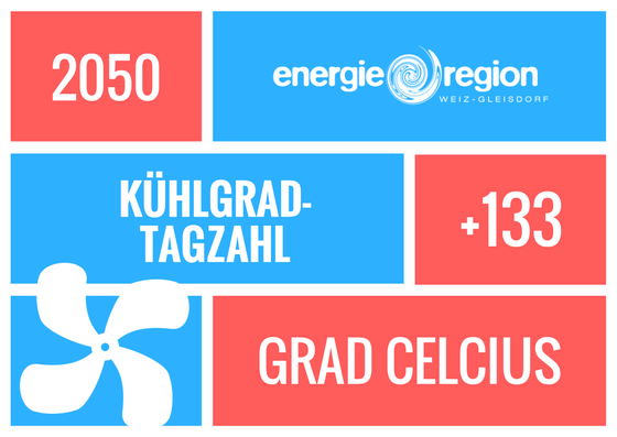 In der Energieregion haben wir aktuell eine Heizgradtagzahl von 3.637 °C. Diese sinkt bis 2050 auf bis zu 3.059 °C. Das ist eine Reduktion des jährlichen Heizbedarfs von knapp 16 %. Gleichzeitig steigt aber die Kühlgradtagzahl von 97 °C auf bis zu 230 °C. Das entspricht beinahe dem 2,5-fachen Kühlbedarf. Diese Entwicklung stellt die Energieversorgung von Gebäuden vor neue Herausforderungen.