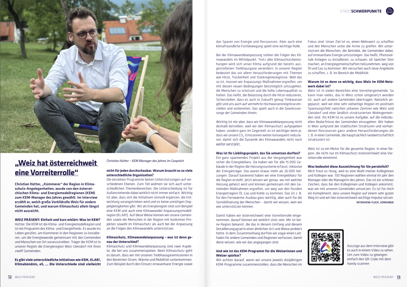 Im Rahmen der diesjährigen Hauptveranstaltung, die in Schwaz in Tirol stattfand, wurde Christian Hütter, KEM-Manager der Energieregion Weiz-Gleisdorf, zum KEM-Manager des Jahres gekürt. Die Auszeichnung, die aus einem Feld von fünf qualifizierten Kandidat:innen vergeben wurde, ist eine besondere Anerkennung für sein Engagement im Klimaschutz und seine herausragenden Aktivitäten in der Region.